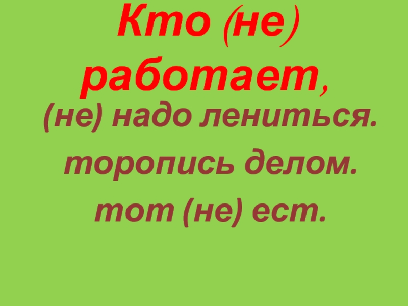Кто (не) работает,(не) надо лениться.торопись делом.тот (не) ест.