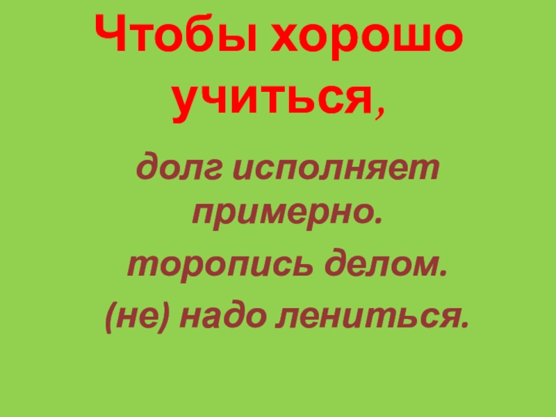 Чтобы хорошо учиться,долг исполняет примерно.торопись делом.(не) надо лениться.