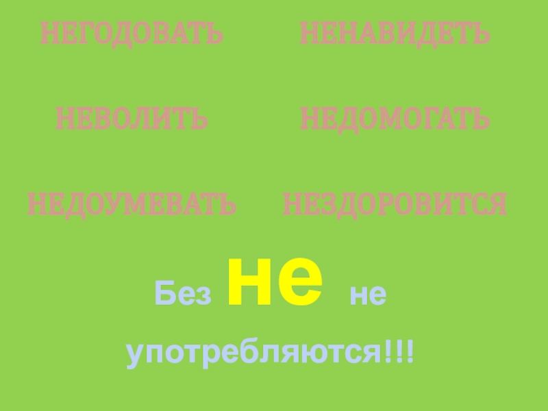 Без не не употребляются!!!НЕГОДОВАТЬНЕВОЛИТЬНЕДОУМЕВАТЬНЕНАВИДЕТЬНЕДОМОГАТЬНЕЗДОРОВИТСЯ