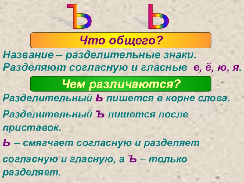 ь – смягчает согласную и разделяет согласную и гласную, а ъ – только разделяет.