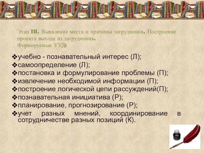Слайд 14Этап III. Выявление места и причины затруднения. Построение проекта выхода из