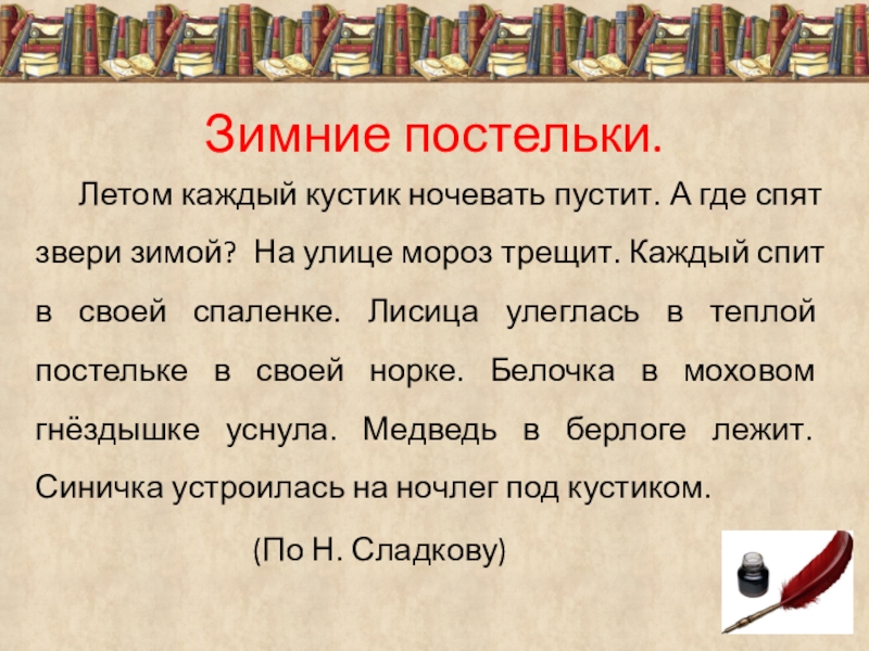 На улице мороз трещит. Каждый спит в своей спаленке. Лисица улеглась в теплой постельке в своей норке. Белочка в моховом гнёздышке уснула. Медведь в берлоге лежит. Синичка устроилась на ночлег под кустиком.