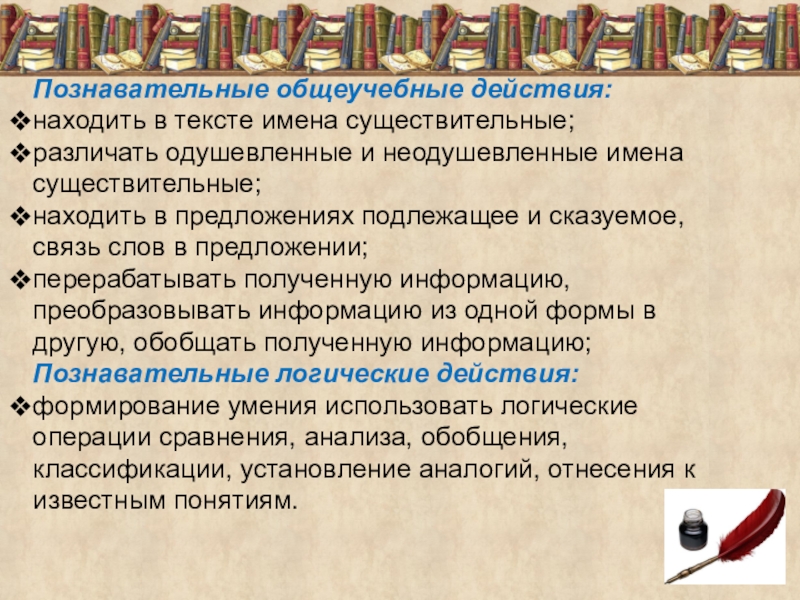 формирование умения использовать логические операции сравнения, анализа, обобщения, классификации, установление аналогий, отнесения к известным понятиям.