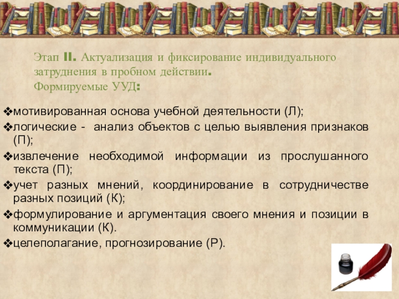 Слайд 12Этап II. Актуализация и фиксирование индивидуального затруднения в пробном действии.