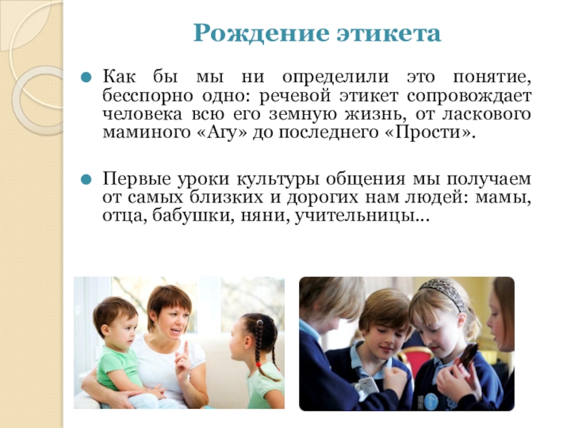 этикет сопровождает человека всю его земную жизнь, от ласкового маминого «Агу» до последнего «Прости».