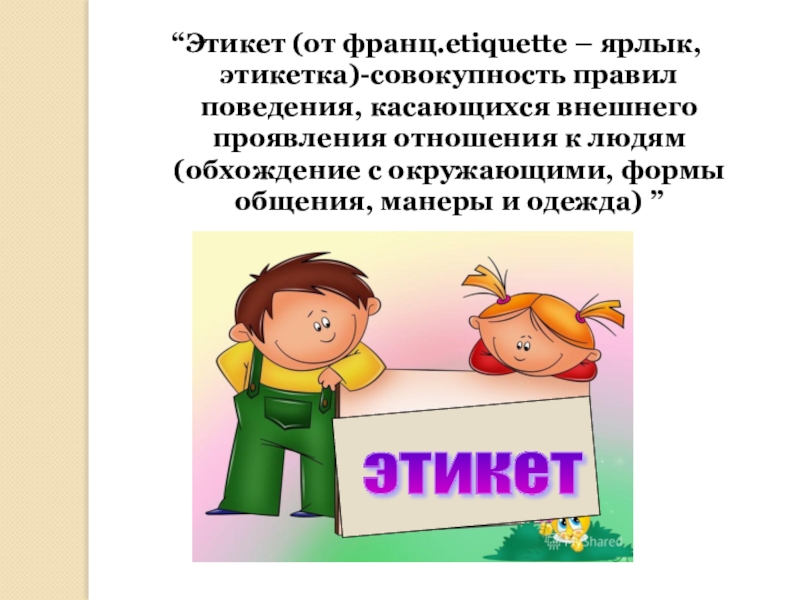 Слайд 2“Этикет (от франц.etiquette – ярлык,этикетка)-совокупность правил поведения, касающихся внешнего проявления отношения