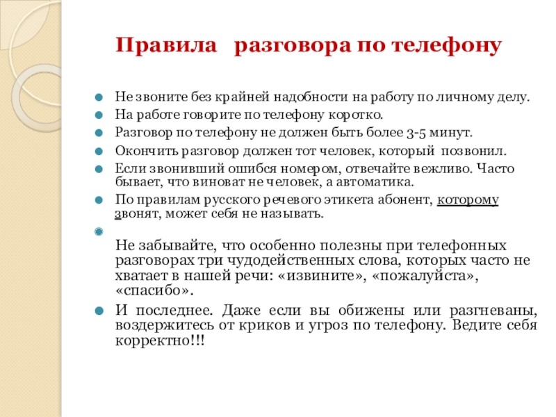 Не забывайте, что особенно полезны при телефонных разговорах три чудодейственных слова, которых часто не хватает в нашей речи: «извините», «пожалуйста», «спасибо».