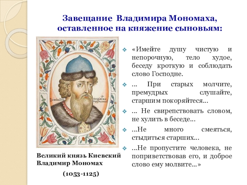 Слайд 11Завещание Владимира Мономаха, оставленное на княжение сыновьям:
