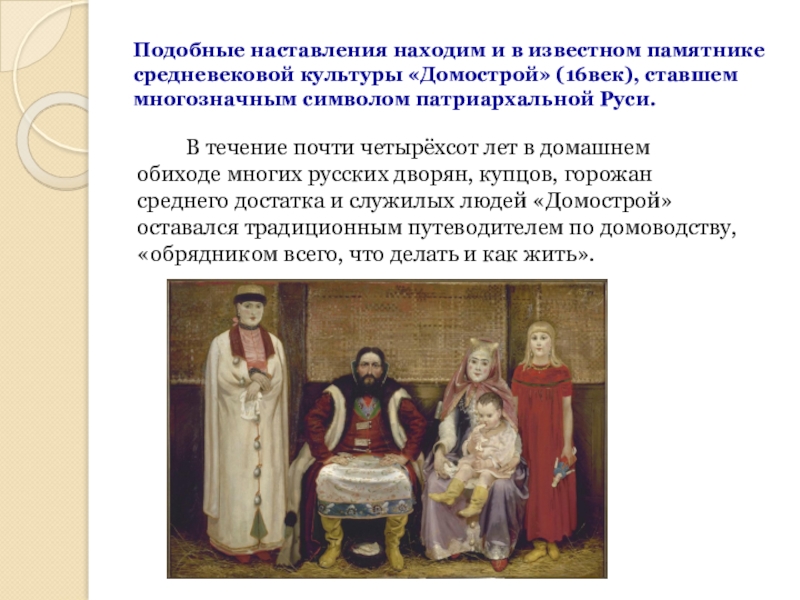 Слайд 12Подобные наставления находим и в известном памятнике средневековой культуры «Домострой» (16век),
