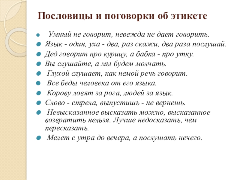 Слайд 16Пословицы и поговорки об этикете