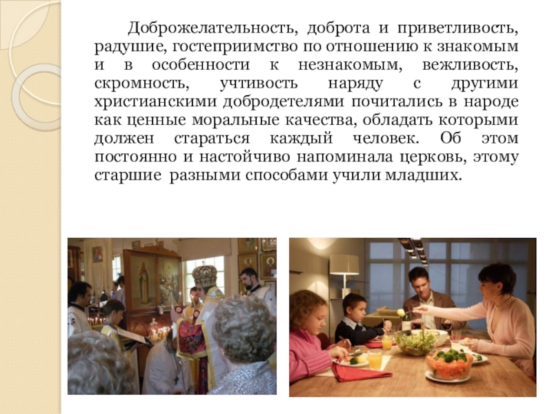 Слайд 10 Доброжелательность, доброта и приветливость, радушие, гостеприимство по отношению к знакомым и