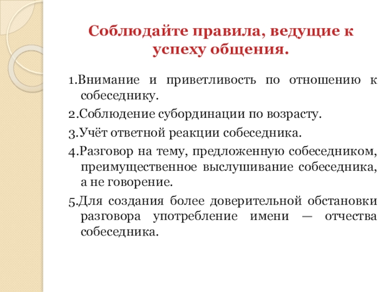 собеседника, избегать неуместных вопросов, обсуждения тем, которые могут оказаться неприятными для него.