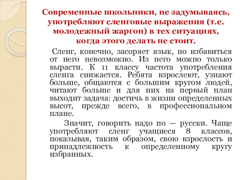 Сленг, конечно, засоряет язык, но избавиться от него невозможно. Из него можно только вырасти. К 11 классу частота употребления сленга снижается. Ребята взрослеют, узнают больше, общаются с большим кругом людей, читают больше и для них на первый план выходит задача: достичь в жизни определенных высот, прежде всего, в профессиональном плане.