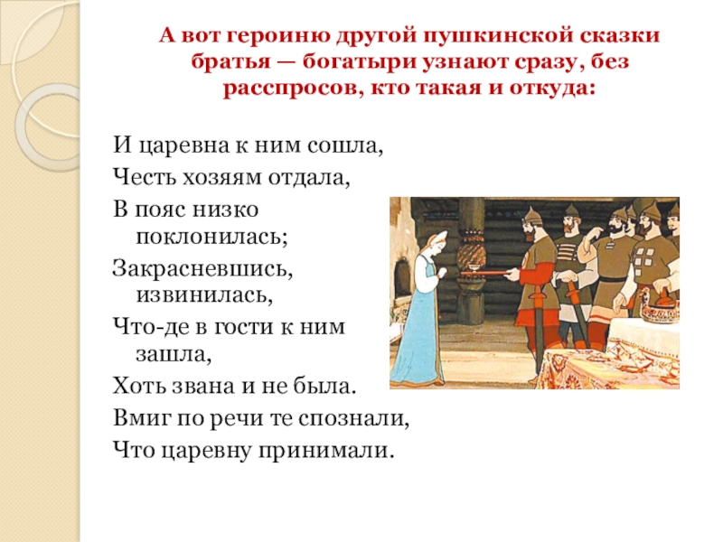 А вот героиню другой пушкинской сказки братья — богатыри узнают сразу,