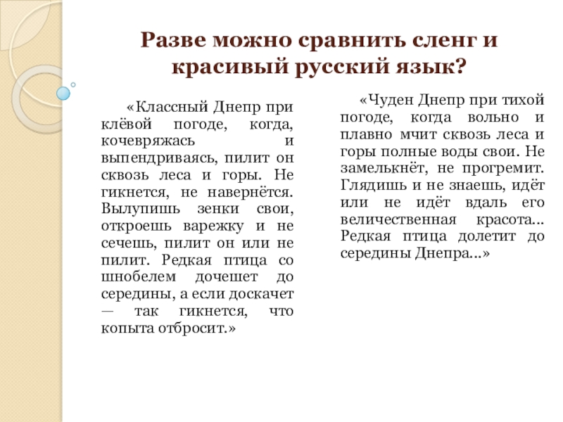 Слайд 23Разве можно сравнить сленг и красивый русский язык?