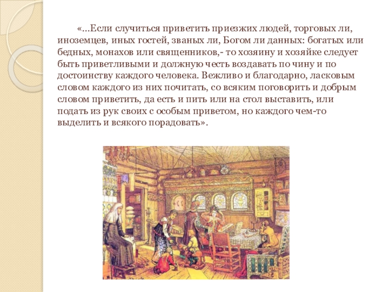 Слайд 14 «...Если случиться приветить приезжих людей, торговых ли, иноземцев, иных гостей, званых