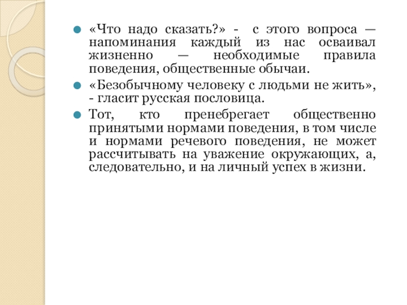 Тот, кто пренебрегает общественно принятыми нормами поведения, в том числе и нормами речевого поведения, не может рассчитывать на уважение окружающих, а, следовательно, и на личный успех в жизни.