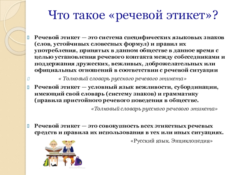 Речевой этикет — условный язык вежливости, субординации, имеющий свой словарь (систему знаков) и грамматику (правила пристойного речевого поведения в обществе.