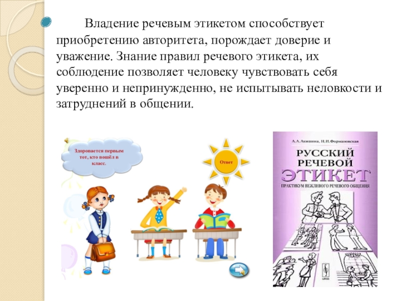 Слайд 4 Владение речевым этикетом способствует приобретению авторитета, порождает доверие и уважение.