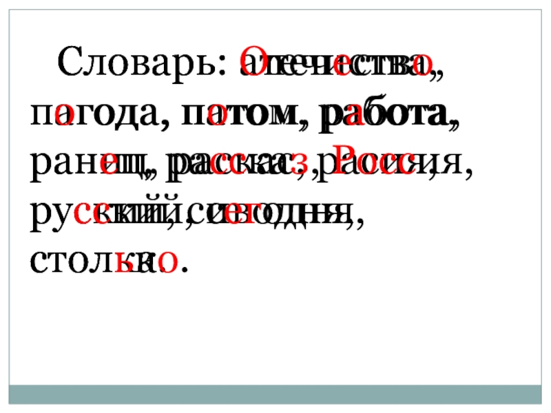 Словарь: Отечество, погода, потом, работа, ранец, рассказ, Россия, русский, сегодня, столько.
