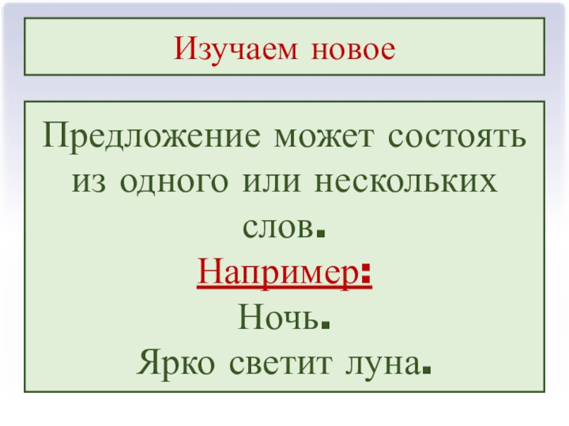 Изучаем новоеПредложение может состоять из одного или нескольких слов.Например:Ночь.Ярко светит луна.