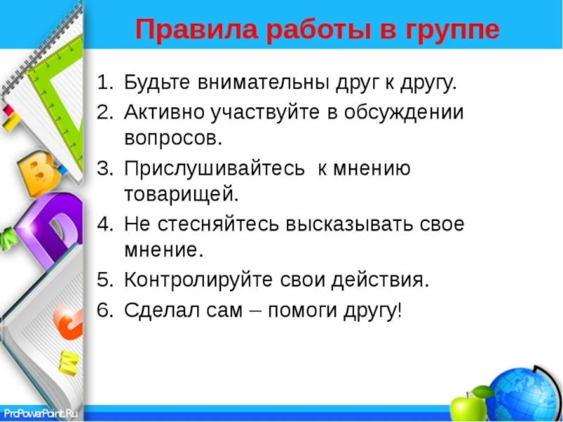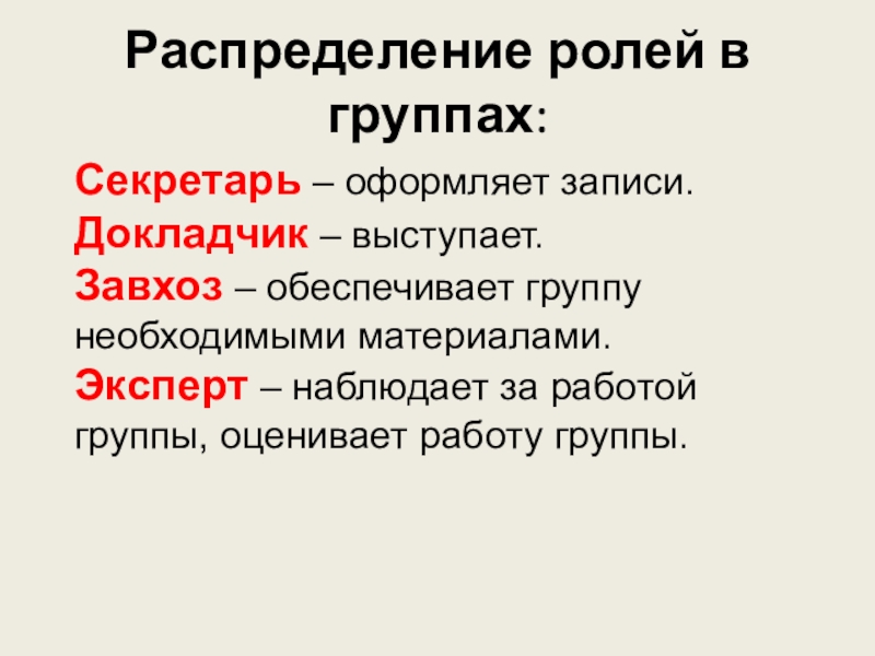 Распределение ролей в группах:Секретарь – оформляет записи.Докладчик – выступает.Завхоз – обеспечивает группу