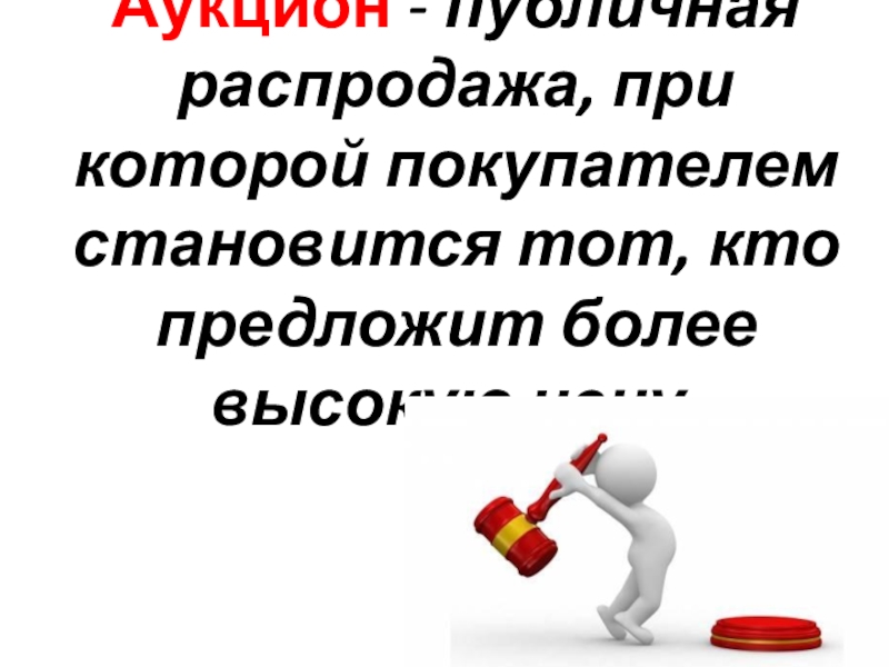 Слайд 4Аукцион - публичная распродажа, при которой покупателем становится тот, кто предложит