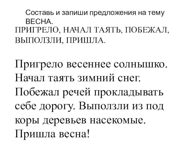 Пригрело весеннее солнышко. Начал таять зимний снег. Побежал речей прокладывать себе дорогу. Выползли из под коры деревьев насекомые. Пришла весна!