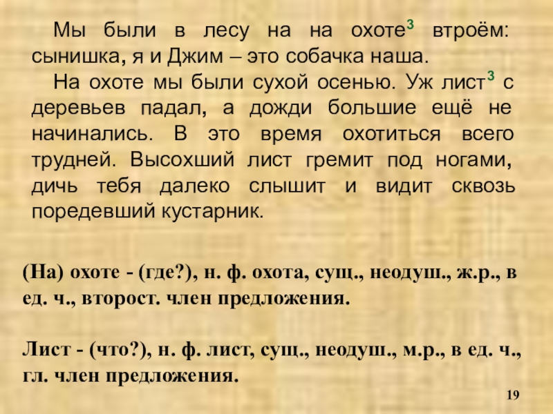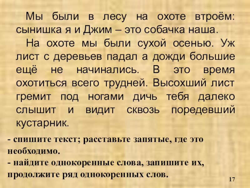 На охоте мы были сухой осенью. Уж лист3 с деревьев падал, а дожди большие ещё не начинались. В это время охотиться всего трудней. Высохший лист гремит под ногами, дичь тебя далеко слышит и видит сквозь поредевший кустарник.