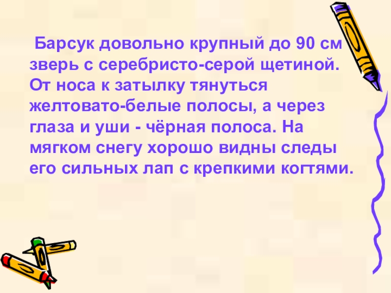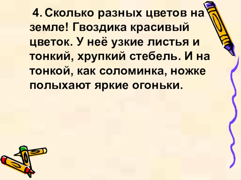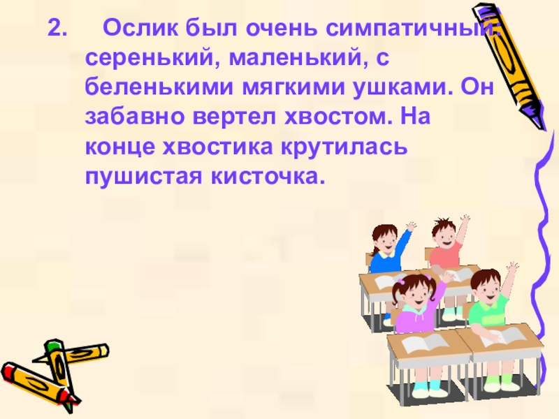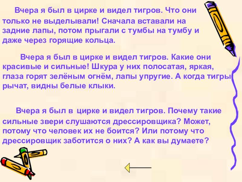 Вчера я был в цирке и видел тигров. Какие они красивые и сильные! Шкура у них полосатая, яркая, глаза горят зелёным огнём, лапы упругие. А когда тигры рычат, видны белые клыки.