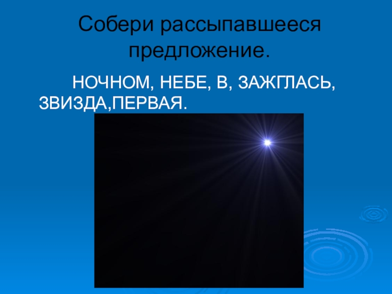 Собери рассыпавшееся предложение.     НОЧНОМ, НЕБЕ, В, ЗАЖГЛАСЬ, ЗВИЗДА,ПЕРВАЯ.