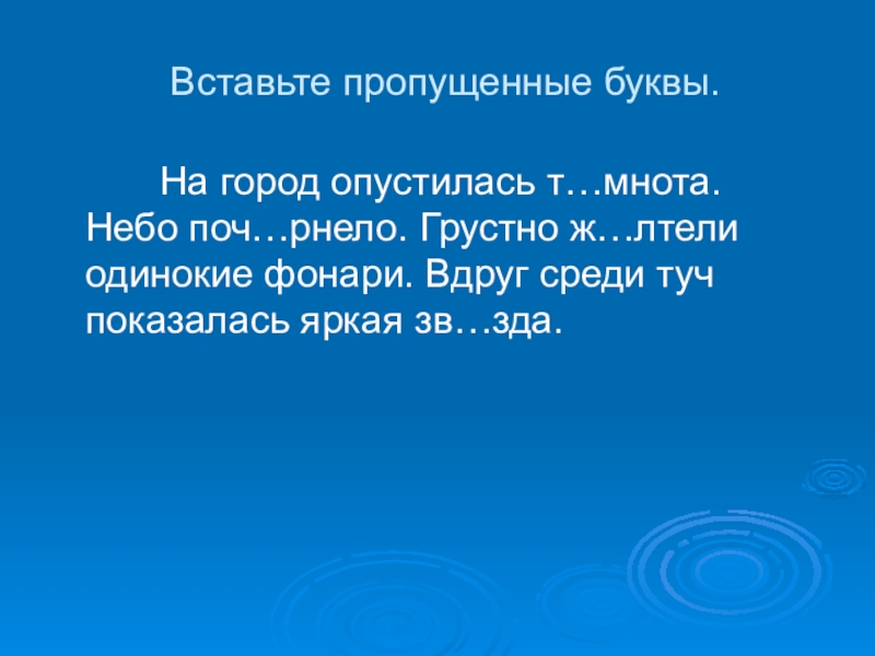 Небо поч…рнело. Грустно ж…лтели одинокие фонари. Вдруг среди туч показалась яркая зв…зда.