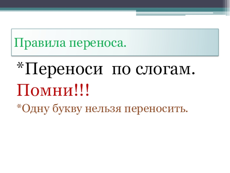 Правила переноса.*Переноси по слогам.Помни!!!*Одну букву нельзя переносить.