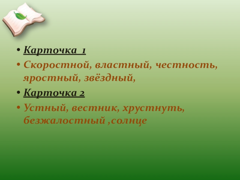 Карточка 1Скоростной, властный, честность, яростный, звёздный,Карточка 2Устный, вестник, хрустнуть, безжалостный ,солнце