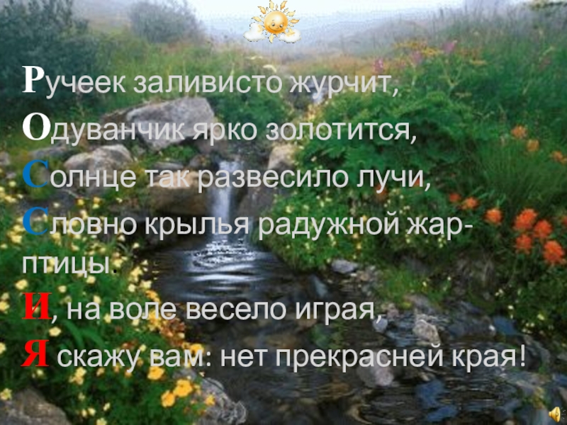 Ручеек заливисто журчит,Одуванчик ярко золотится,Солнце так развесило лучи,Словно крылья радужной жар-птицы.И, на воле весело играя,Я скажу вам: