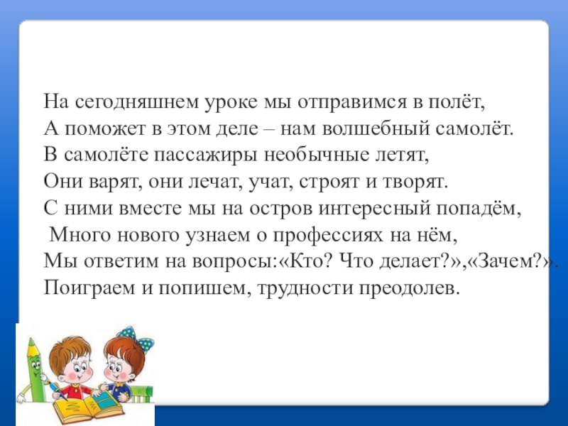 На сегодняшнем уроке мы отправимся в полёт,А поможет в этом деле – нам волшебный самолёт.В самолёте пассажиры необычные летят, Они варят, они лечат, учат, строят и творят.С ними вместе мы на остров интересный попадём, Много нового