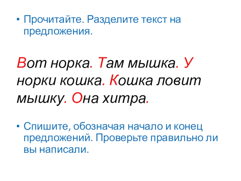 Вот норка. Там мышка. У норки кошка. Кошка ловит мышку. Она хитра.