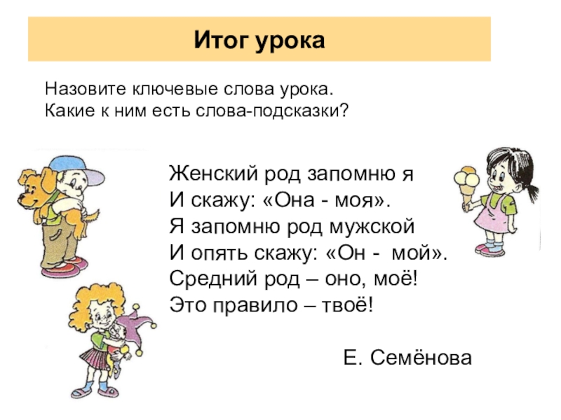 Итог урока Назовите ключевые слова урока.Какие к ним есть слова-подсказки?Женский род запомню яИ скажу: «Она -