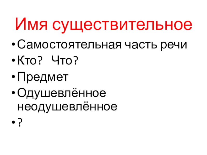 Имя существительноеСамостоятельная часть речиКто?  Что?ПредметОдушевлённое неодушевлённое?