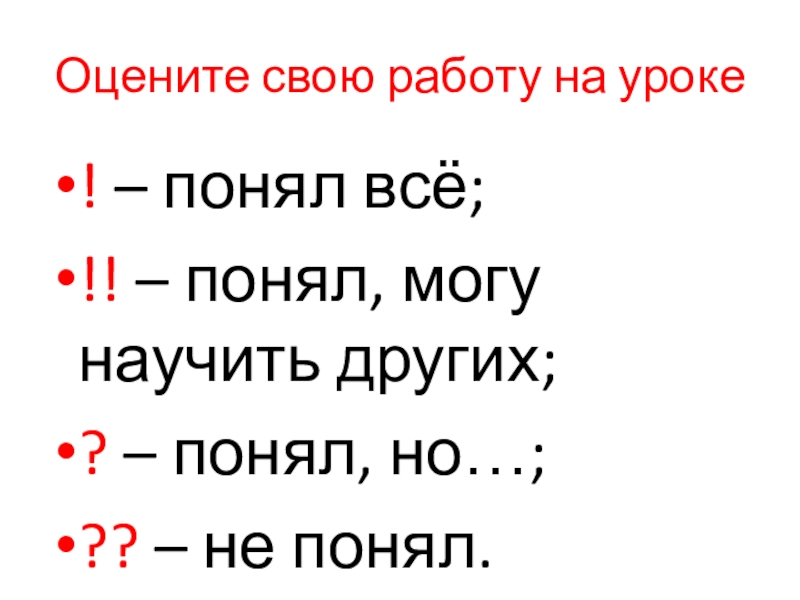 Оцените свою работу на уроке! – понял всё;!! – понял, могу научить других;? – понял, но…;?? –