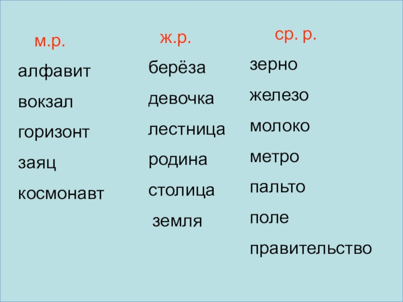 м.р.алфавитвокзалгоризонтзаяцкосмонавт  ж.р.берёзадевочкалестницародинастолица земля      ср. р.зерножелезомолокометропальтополеправительство
