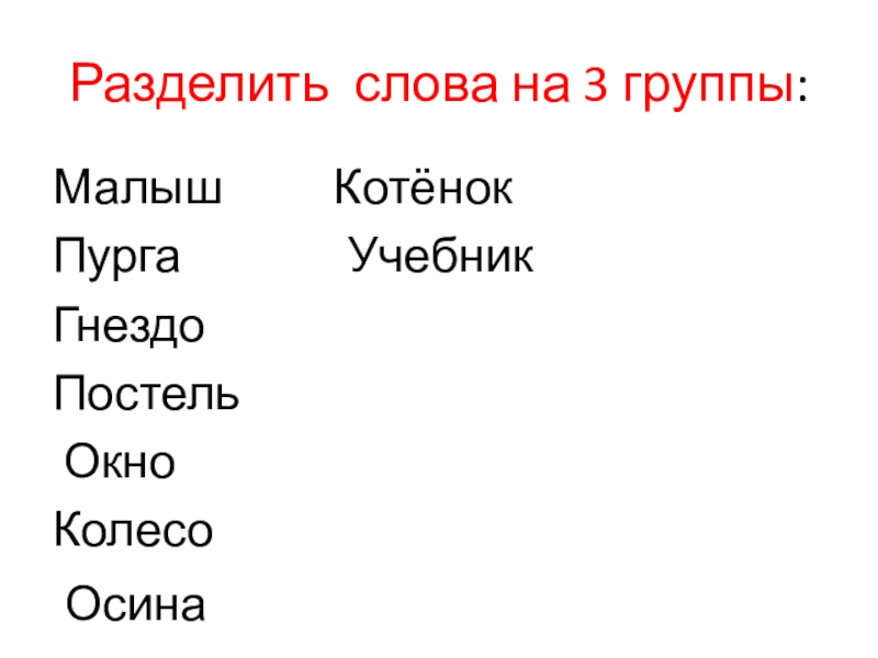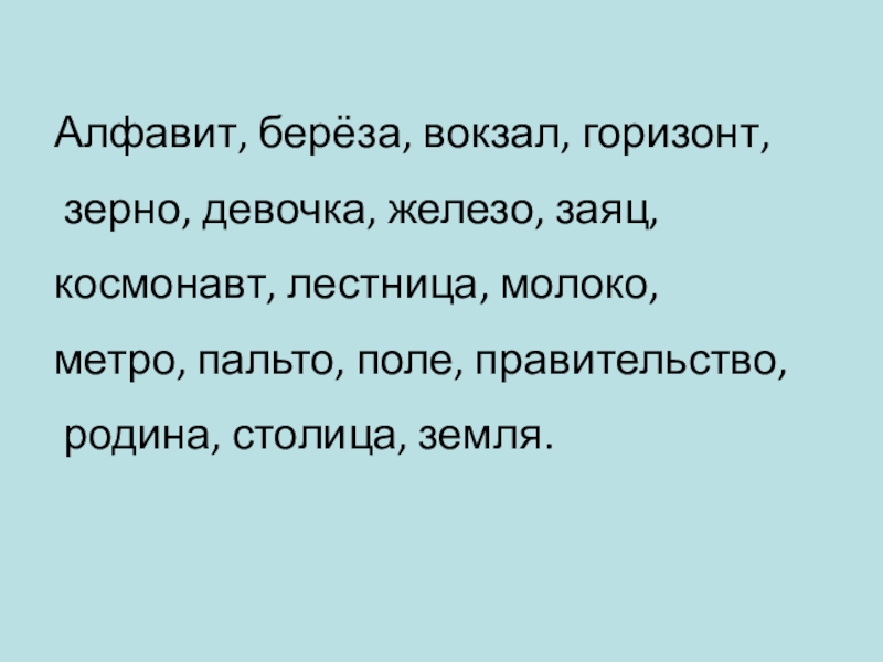 Алфавит, берёза, вокзал, горизонт, зерно, девочка, железо, заяц, космонавт, лестница, молоко, метро, пальто, поле, правительство, родина, столица,