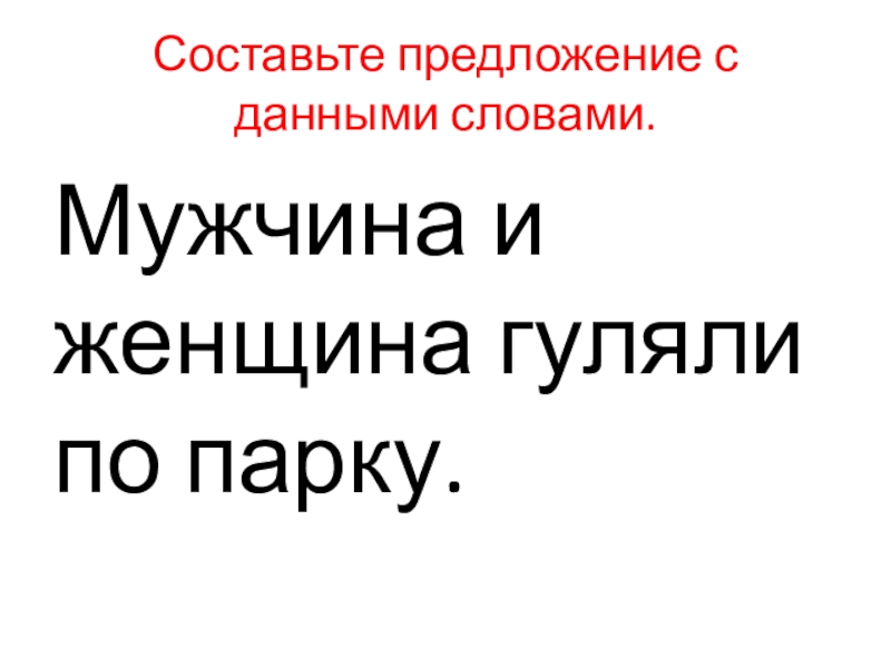 Составьте предложение с данными словами.Мужчина и женщина гуляли по парку.