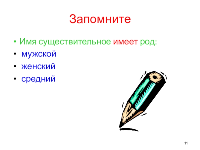 ЗапомнитеИмя существительное имеет род: мужской женский средний