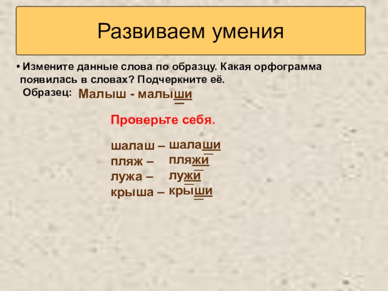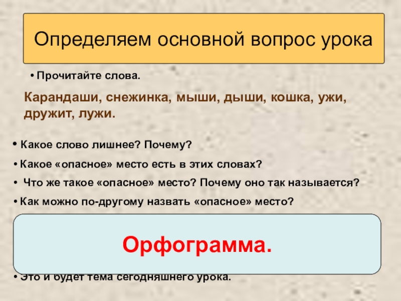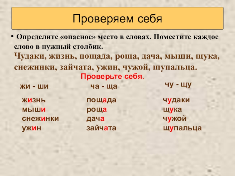 Карандаши, снежинка, мыши, дыши, кошка, ужи, дружит, лужи.