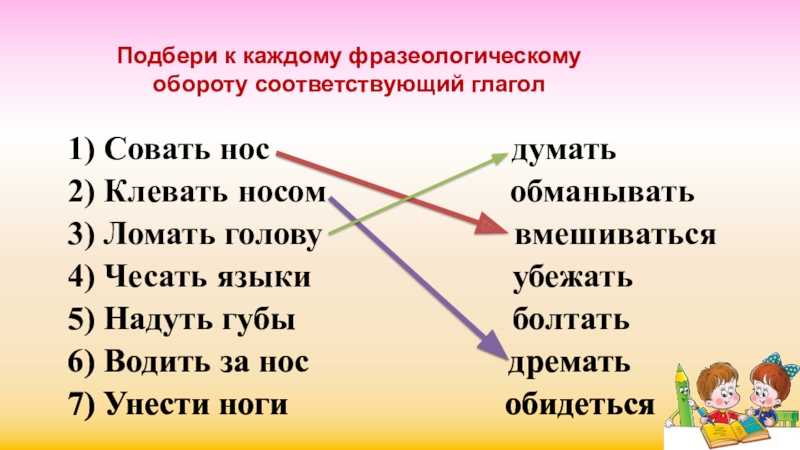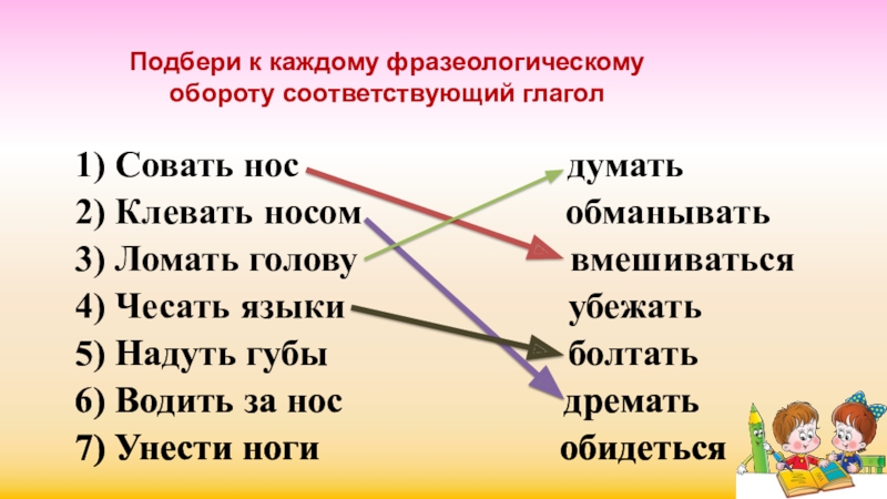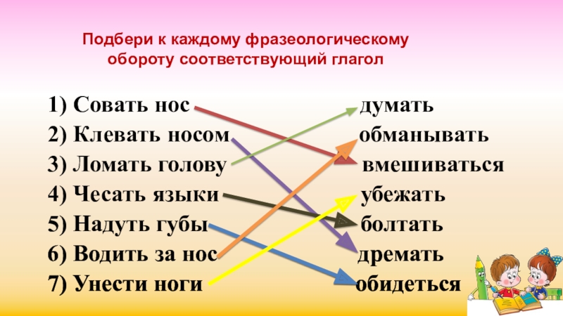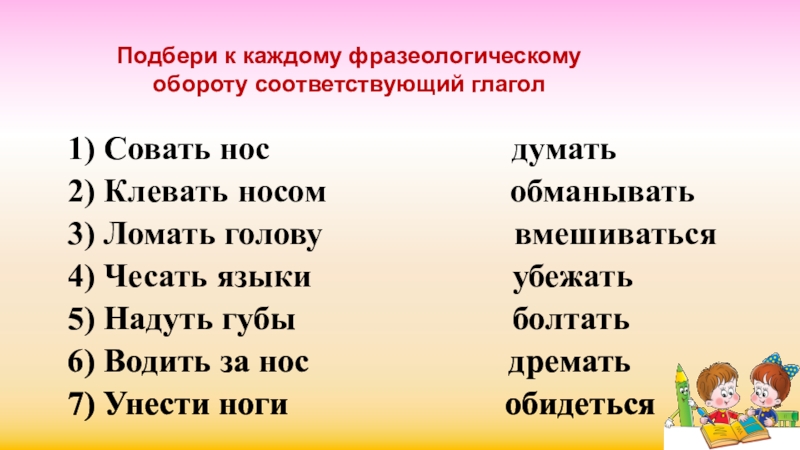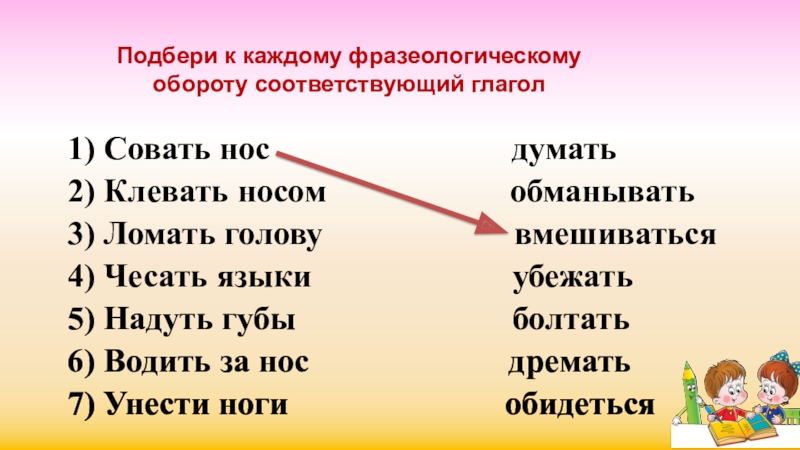 Слайд 26Подбери к каждому фразеологическому обороту соответствующий глагол