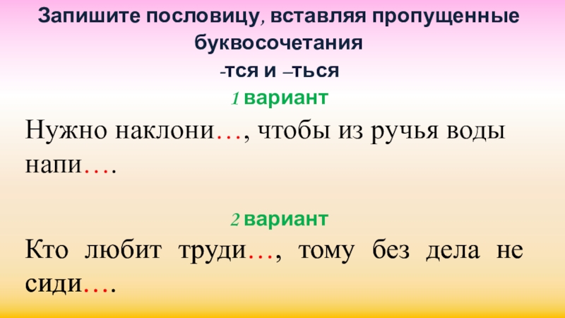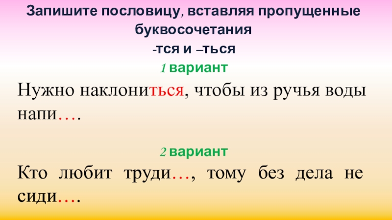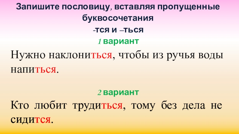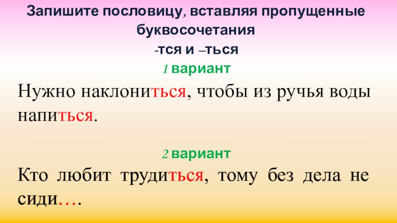 Запишите пословицу, вставляя пропущенные буквосочетания -тся и –ться1 вариантНужно наклони…, чтобы из ручья воды напи…. 2 вариантКто