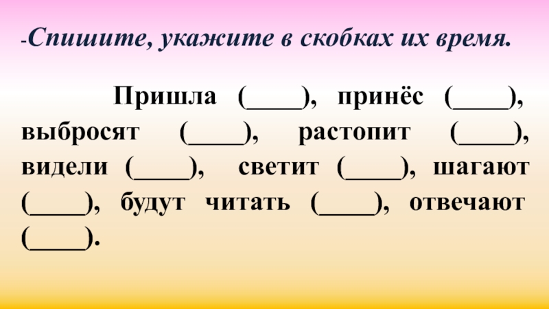 -Спишите, укажите в скобках их время.    Пришла (____), принёс (____), выбросят (____), растопит (____),