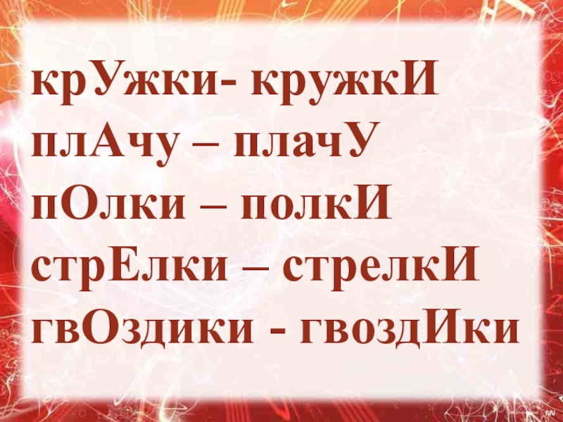 крУжки- кружкИплАчу – плачУпОлки – полкИстрЕлки – стрелкИгвОздики - гвоздИки
