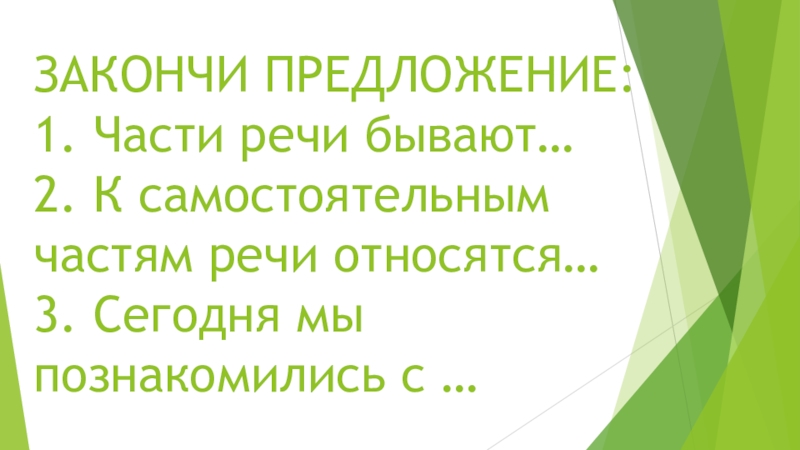 Слайд 39ЗАКОНЧИ ПРЕДЛОЖЕНИЕ: 1. Части речи бывают… 2. К самостоятельным частям речи относятся… 3. Сегодня